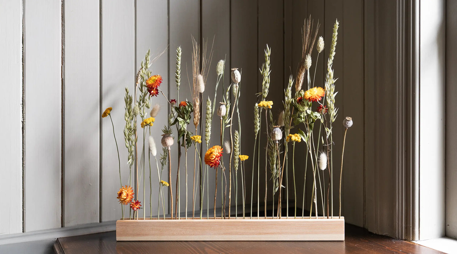 Blomlist Autumn Glow med tørrede blomster i varme efterårstoner af orange og gul. En smuk indretningsdetalje, der også passer perfekt som gave! Eksempler på blomster, der kan indgå, er evighedsblomster, valmuer og kornsorter. Hæng blomlisten på væggen, stil den på bordet eller brug den som en dekorativ afskærmning i vinduet. Listen fås i tre størrelser og leveres direkte hjem til døren.